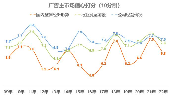 ●《2022中國廣告主營(yíng)銷(xiāo)趨勢調查》報告(以下簡(jiǎn)稱(chēng)報告)顯示,2022年受疫情反復、行業(yè)變革等國內外復雜環(huán)境影響,廣告主的信心指數(廣告主針對國內整體經(jīng)濟形勢、行業(yè)發(fā)展前景、公司經(jīng)營(yíng)情況的信心打分)相對于2021年有所回落,但仍高于2020年的疫情之初。