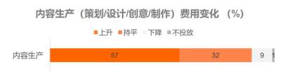 ● 媒體廣告、內容營(yíng)銷(xiāo)、私域運營(yíng)、行業(yè)公關(guān)等所有營(yíng)銷(xiāo)行為,都需要內容填充。隨著(zhù)算法極大縮短了內容傳播的周期,廣告主對內容的需求會(huì )呈現冪次增長(cháng),內容生產(chǎn)和產(chǎn)品生產(chǎn)一樣,成為企業(yè)的重投入。報告顯示,57%的被訪(fǎng)廣告主在2022年增加內容生產(chǎn)的費用投入。
