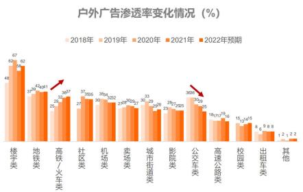 ● 高鐵/火車(chē)類(lèi)戶(hù)外廣告連續增長(cháng),2021年滲透率超過(guò)社區類(lèi)和機場(chǎng)類(lèi)。而公交車(chē)類(lèi)戶(hù)外廣告,則連續走低。