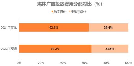 ● 2021年的調查顯示,數字媒體獲得了更多的廣告預算,費用占比為63.6%。到了2022年,數字媒體的分配占比將再提升近3個(gè)百分點(diǎn)。
