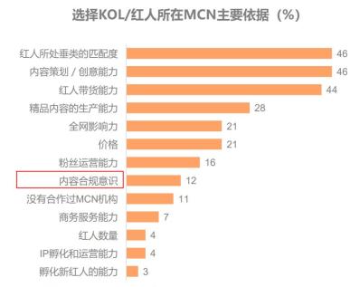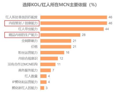 ● 例如,廣告主選擇KOL/紅人所在的MCN的主要依據是內容策劃/創(chuàng )意能力、精品內容的生產(chǎn)能力。
