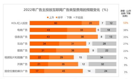 ● 互聯(lián)網(wǎng)廣告類(lèi)型方面,2022年六成廣告主預期會(huì )增加KOL/紅人的投放費用。紅人擁有粉絲群體,自帶流量,擁有穩定的原創(chuàng )內容輸出能力,同時(shí),在不同紅人之間可以形成組合投放,在電商大促等大型推廣環(huán)節可以實(shí)現品牌聲量放大。相比之下,視頻貼片和插播廣告、固定位置展示廣告和開(kāi)屏廣告的投放費用下降率較高,廣告主對純展示類(lèi)的互聯(lián)網(wǎng)廣告類(lèi)型興趣下滑。